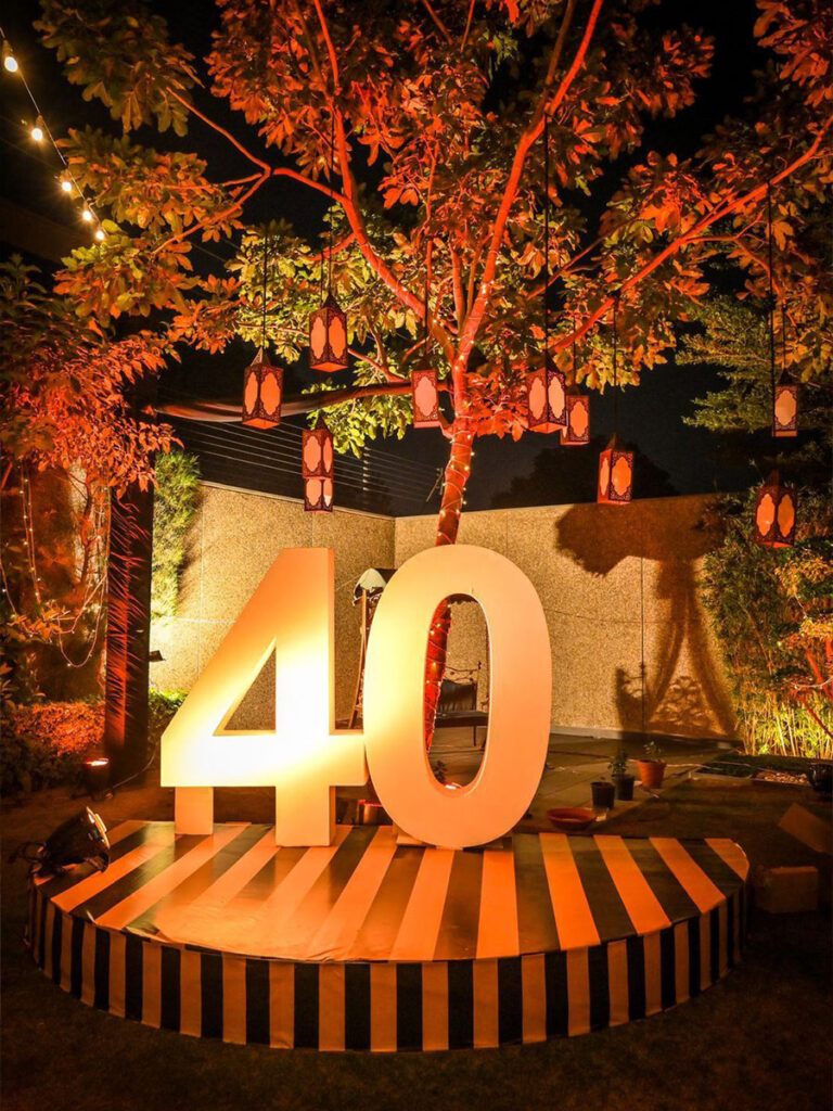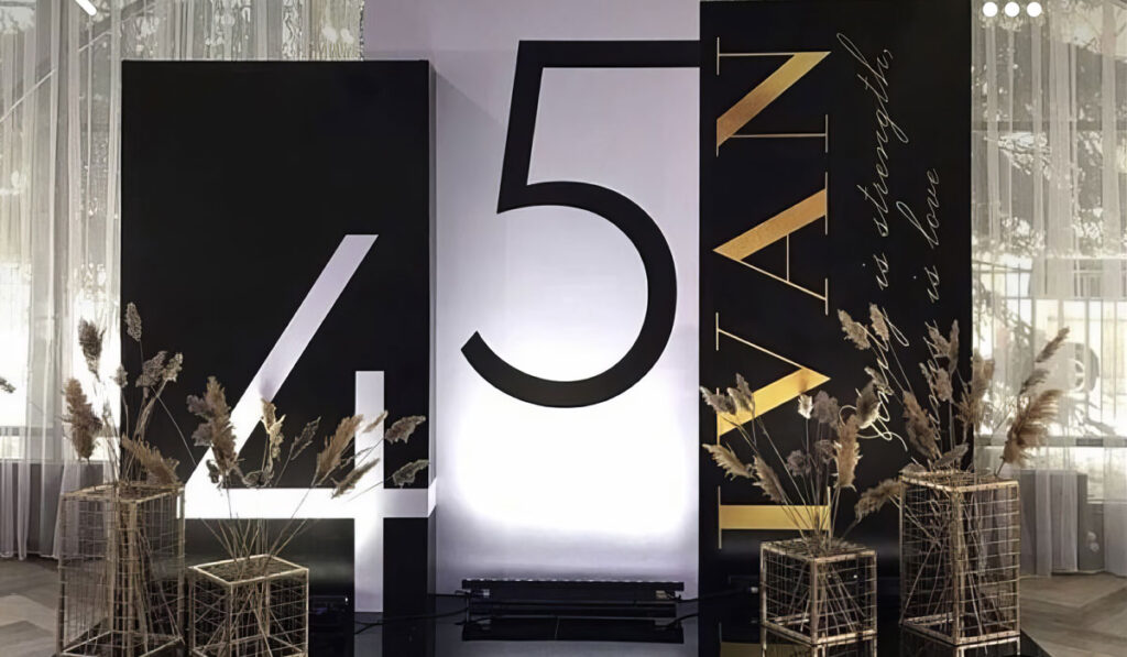 Props personalizados y artículos para fotos que añaden un toque divertido y diferente al evento, así como otros detalles decorativos como letras gigantes, números, globos y elementos temáticos.